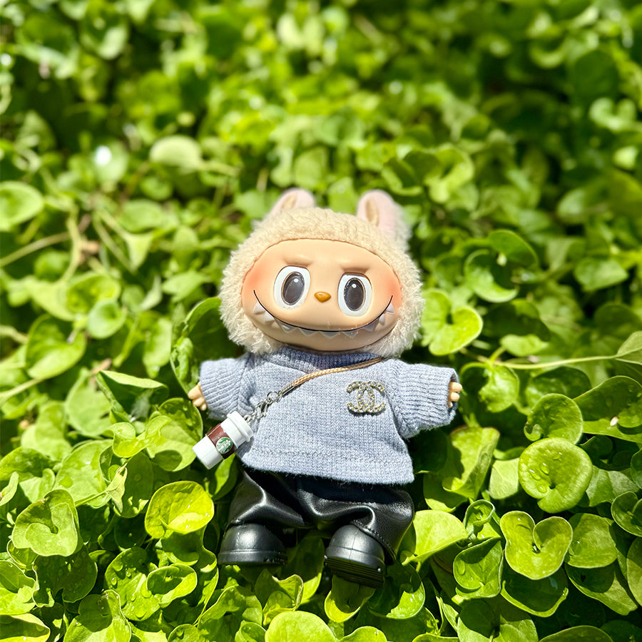 Your Labubu’s off-duty look just got a serious upgrade. This street-style set includes a soft gray knit sweater with a rhinestone brooch detail, shoes, sleek faux leather pants, and an adorable mini coffee charm (yes, that’s a Starbucks cup). Perfect for plushie strolls, café dates, or just serving looks from the shelf.