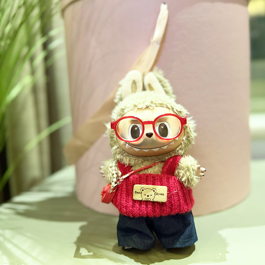This look is bringing full plush power. Featuring a fiery red knit teddy vest, oversized red glasses, and classic jeans, Labubu tops it off with a mini red Chanel bag—because being clever never goes out of style.