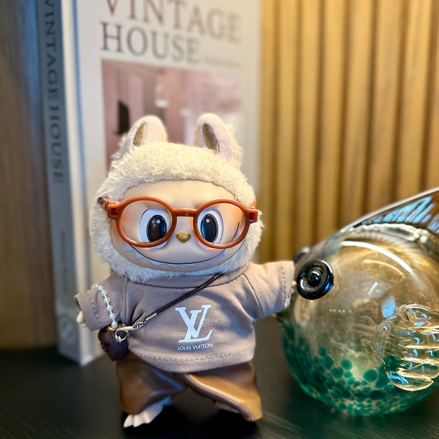 Smart, stylish, and effortlessly chic — this Labubu look is dripping in refined flex. Featuring a taupe Louis Vuitton-inspired sweatshirt, faux leather trousers, pearl-accent mini crossbody, and statement amber glasses, this outfit says “I read fashion editorials before breakfast.” Perfect for plushies with elite taste and bookish charm.