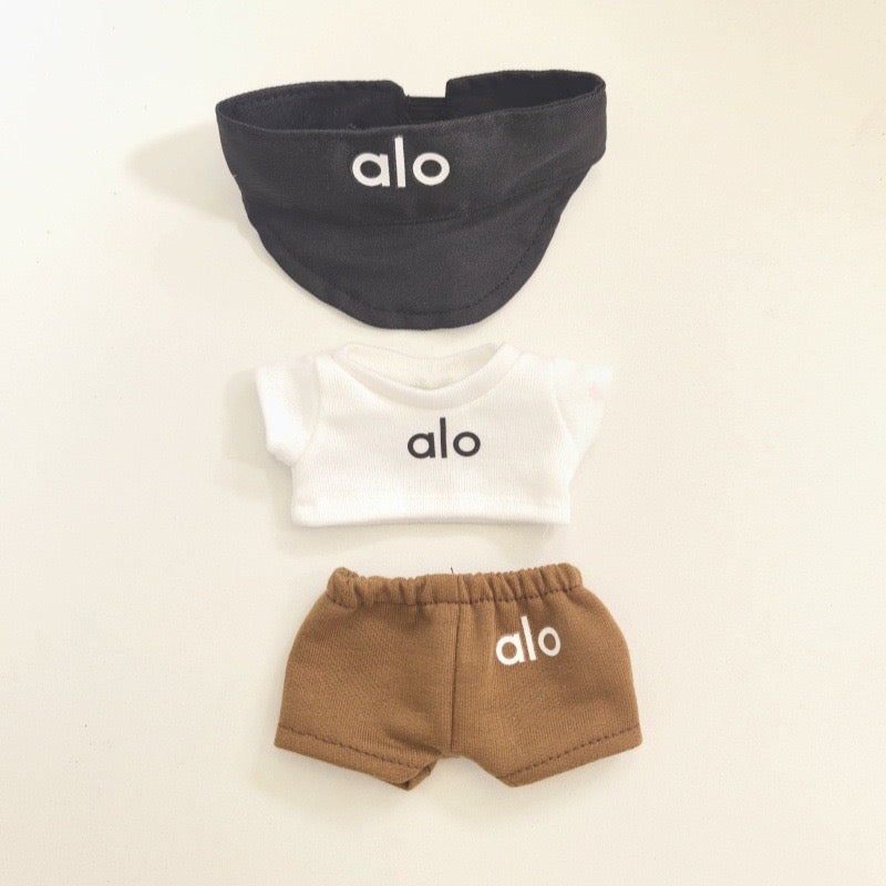 Earthy tones, elevated style. This Alo-inspired set features a crisp white crop tee, warm khaki shorts, and a sleek black visor for the perfect mix of sporty and chic. Whether it’s yoga flow or a shelf-side strut, your Labubu’s ready.