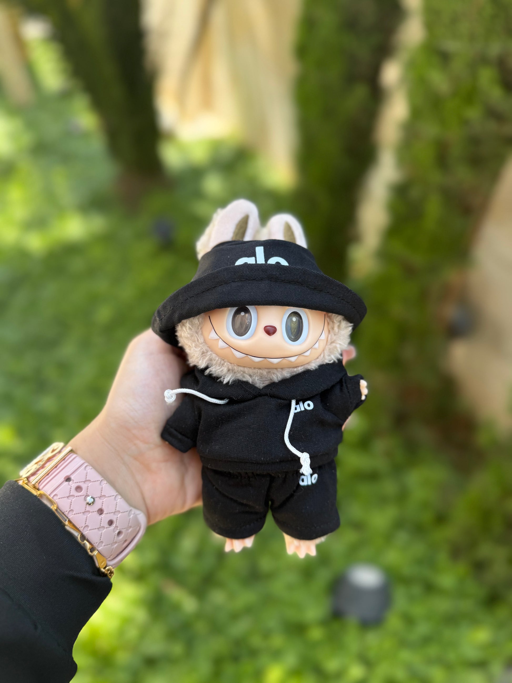 Drip. Delivered. This all-black Alo-inspired set brings serious streetwear energy to your Labubu. Complete with a matching hoodie, joggers, and the ultimate flex: a bold bucket hat. It's comfy, cool, and made for main character moments.